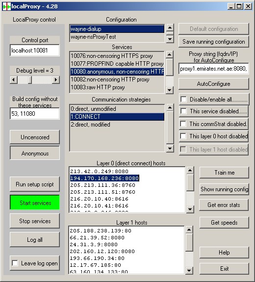 This is essentially a character switch, with some interest in the content switched. Normally run on the user's computer (but runnable on a Unix ISP shell outside the user's firewall) this application provides a user with localhost services to use which implement censor avoidance strategies in the background. A front end GUI  is included which allows convenient control of the localProxy engine. A single 'AutoConfigure' button allows even a novice user to map his local firewall rules and create a configuration file which describes his network environment, specifies proxy capabilities which may be used to enable (by default) uncensored HTTP proxy and Usenet News services; selection of this configuration will cause LP to build and run the configuration. LocalProxy will build a running configuration based on a database of usable hosts and proxies, applying several sources of information relevant to accessible hosts, services, firewall rules and firewalled subnets. LocalProxy runs this configuration and makes connections for the user, learning to use the fastest and most reliable of the censor-avoidance strategies and multiple proxy hosts/chains available. The application maintains (and displays) a 'useful data speed' for each level of the 'user'->'strategy'->'host'->'host'->website/service chain, to assist the user with configuration. The choices made by localProxy in switching each request is based on these speeds, ensuring localProxy avoids non-working strategies/hosts, and ensuring maximum use of the available 'uncensored bandwidth'. Failover capabilities and robustness are built in, so that users need not frequently update the database of hosts whenever one dies, becomes blocked, or is temporarily down.